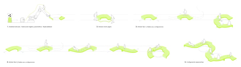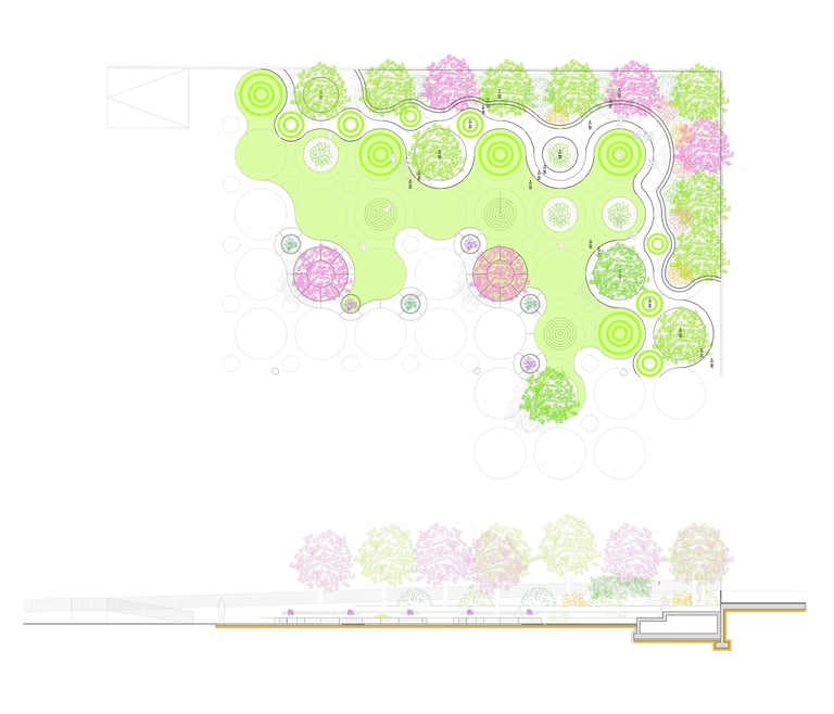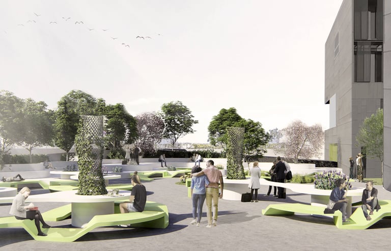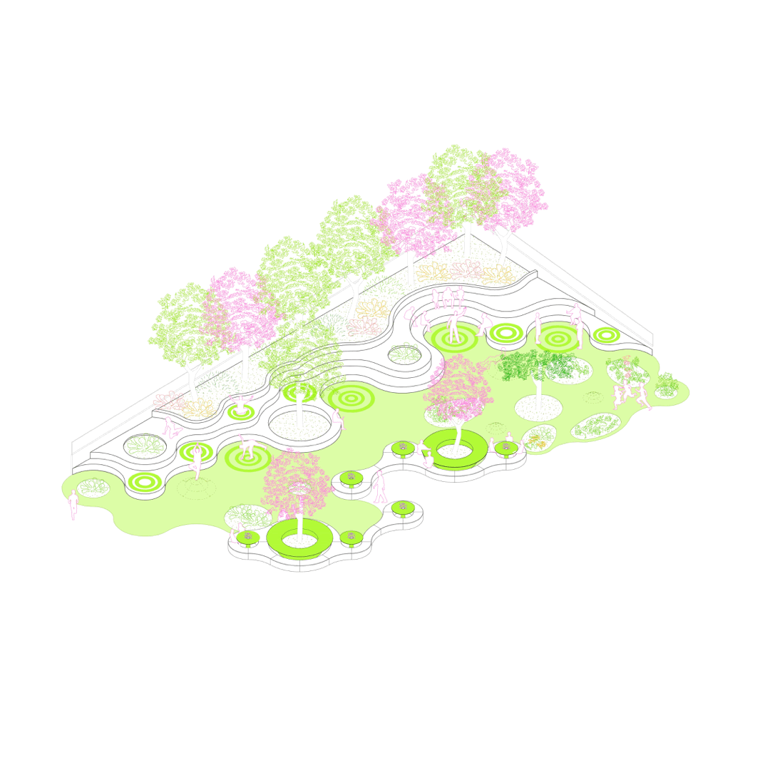 Transformation of an existing outdoor area into a series of microclimatic agoras, creating communal spaces for interaction, study, and relaxation. Designed through a generative, explorative workflow, the project introduces organic geometries, integrated greenery, and 3D-printed furniture, blending innovative materials with nature-based strategies. The result is a contemporary, sustainable environment that revitalizes the campus and enhances comfort and social life.