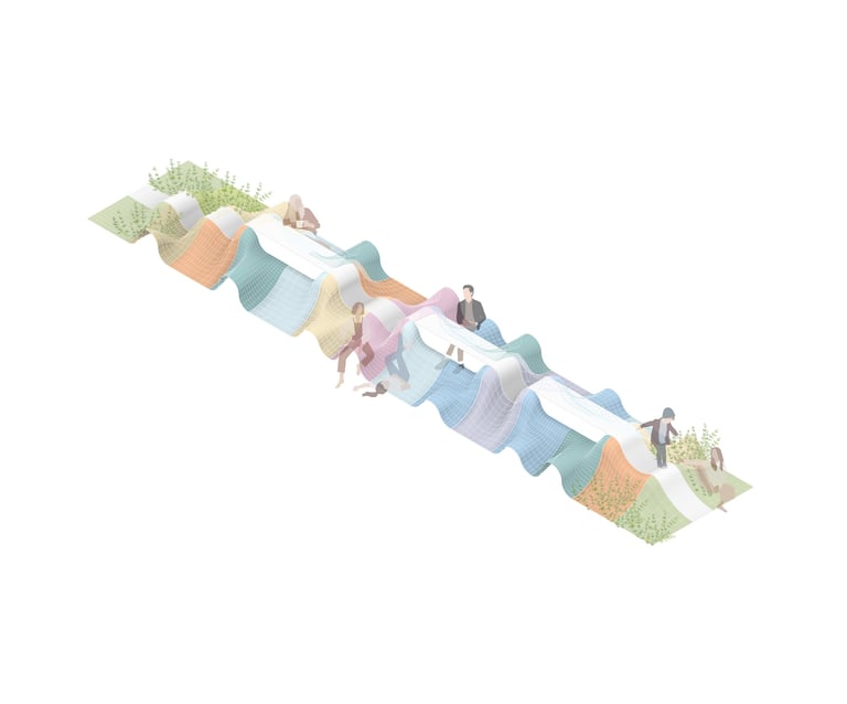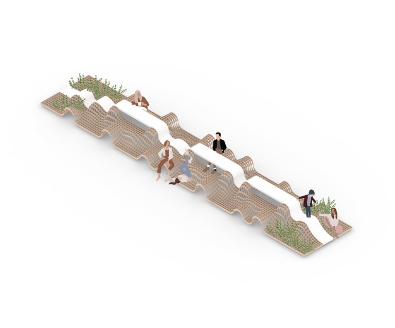 A modular bench system designed for the University of Málaga, featuring an organic, wave-like form that integrates seating, lounging, and greenery into a single fluid gesture. Through a generative design workflow, its adaptable geometry incorporates a central communal surface and embedded planting zones, creating a multifunctional piece that seamlessly blends usability, landscape, and sustainability.