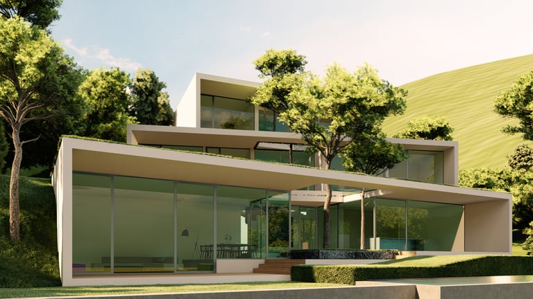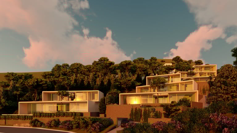 Modern hillside homes designed through environmental simulations to maximize views, natural light, and thermal comfort. Each unit is strategically rotated and shaped to optimize solar exposure, while clean geometric lines and integrated green patios create a seamless connection between architecture and landscape. The result is a series of bright, comfortable, and environmentally responsive living spaces.